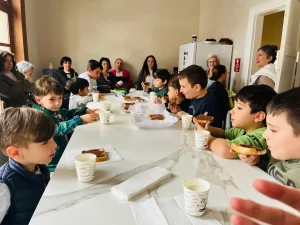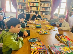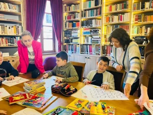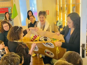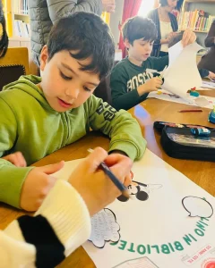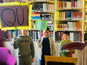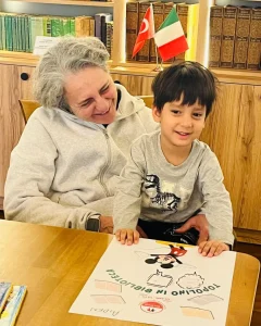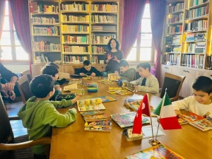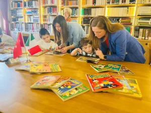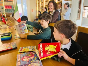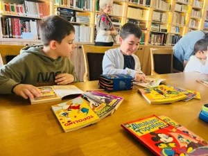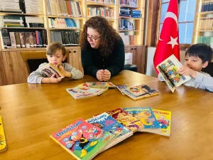 I bambini della primaria e dell’infanzia, insieme ai genitori, hanno visitato la biblioteca di Casa Italia ad Izmir. Accolti da Laura De Santo, responsabile della biblioteca, e Martina Lilli del Centro Culturale Italiano, hanno scoperto il mondo di Topolino e partecipato a un’attività di scrittura creativa. Per ringraziare dell’ospitalità, hanno lasciato in dono una simpatica opera da veri “Topolini di biblioteca”!
